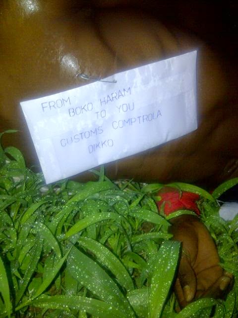 Early today, this body was found in front of one of the Custom office in abuja with a letter on it saying "from boko haram to Custom Comptroller Dikko"